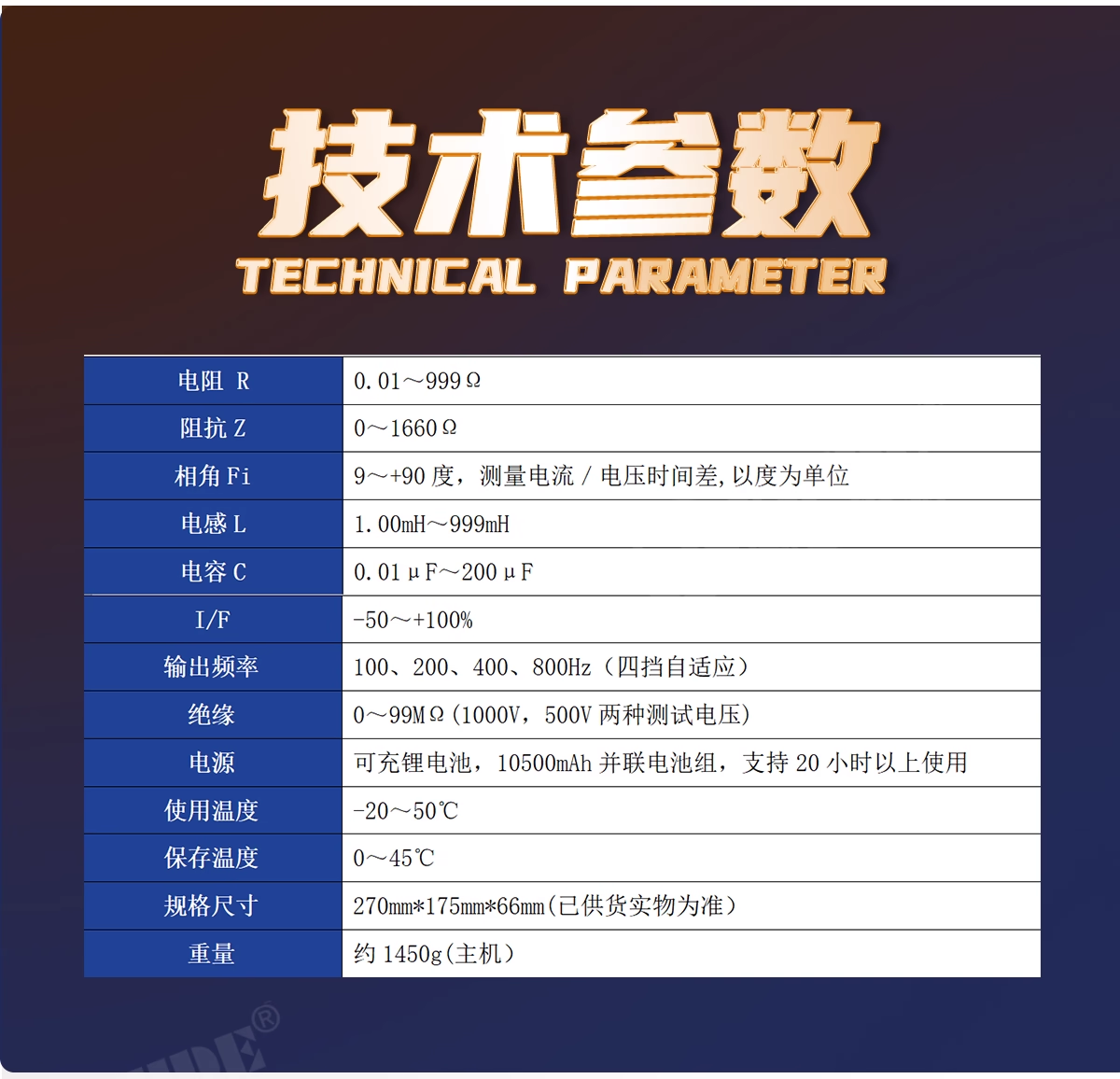 宁波瑞德生产的RUIDE-DJ03plus电机故障检测仪 主要针对电机本体故障(绕组匝间、层间、相间、转子)分析的静态无损电路分析技术,操作简单,判断准确。测试电阻:0.01-999Q;测试电感:1.00mH-999mH;测试电容:0.01uF-200uF或 2-2000n;测试相角:0-90°;测试绝缘:0-99MQ,1000V,500V可选;输出频率:100-800Hz;1/F:-50%-50%;屏幕分辨率:1280*800;屏幕尺寸:7.1寸